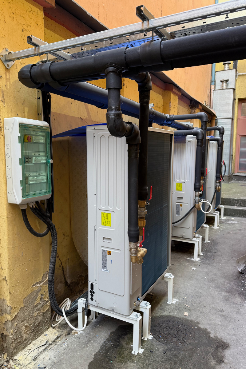 Intenzív igénybevételre tervezett gépészet. A monoblokkos kialakítás (víz alapú hőleadás) kiválóan illeszkedik az épület meglévő rendszeréhez, csendes üzeme pedig nem zavarja a teraszon ülő vendégeket.