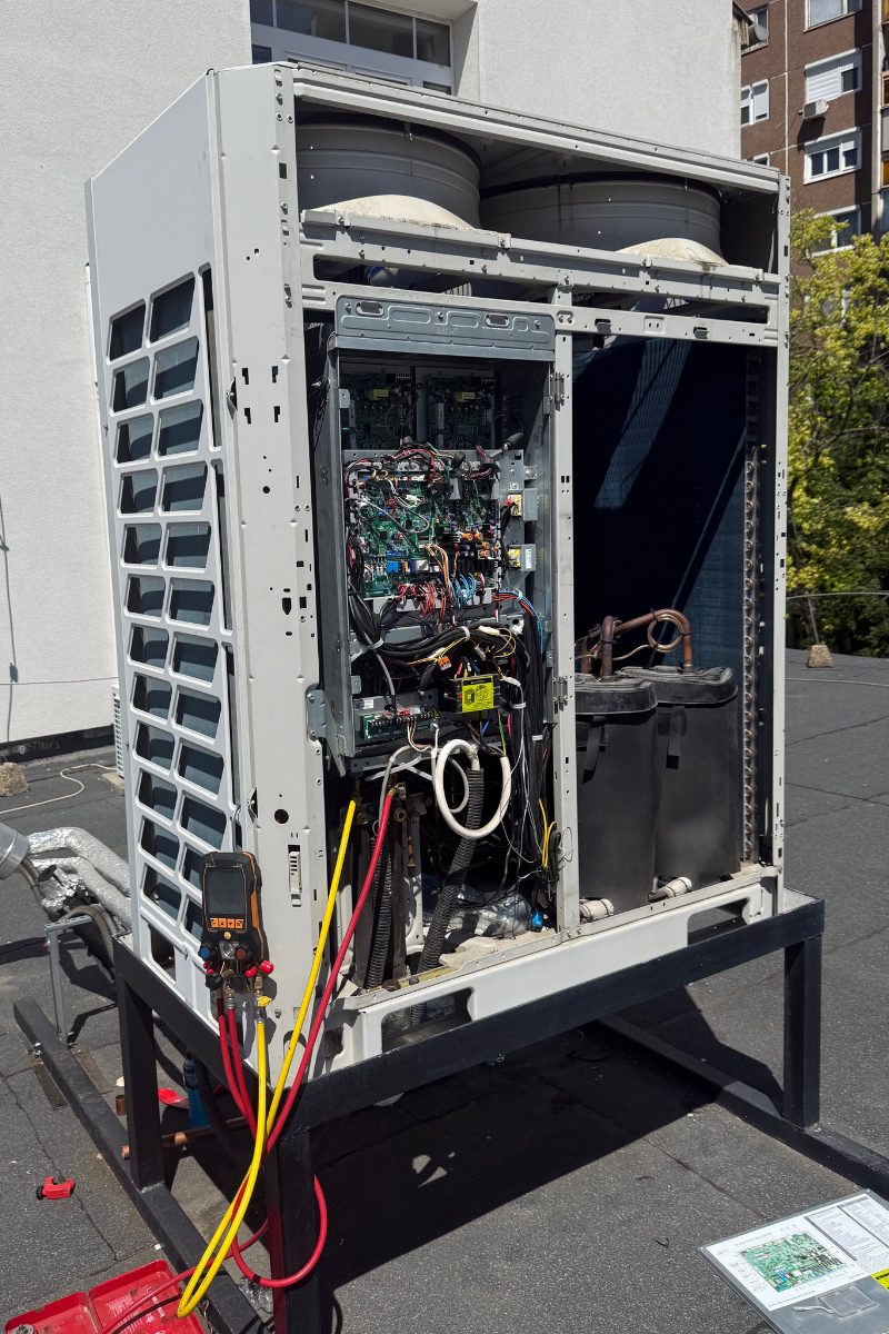 Egy irodaház gépészete a folyamatos működésről szól. A képen a rendszer diagnosztikai mérése látható: preventív karbantartással előzzük meg a leállásokat, biztosítva a munkahelyi komfortot több száz dolgozó számára.