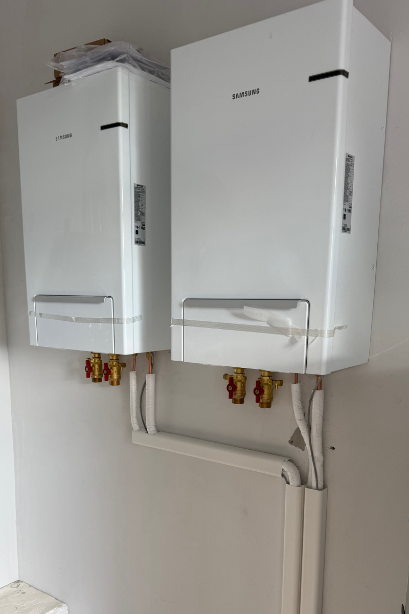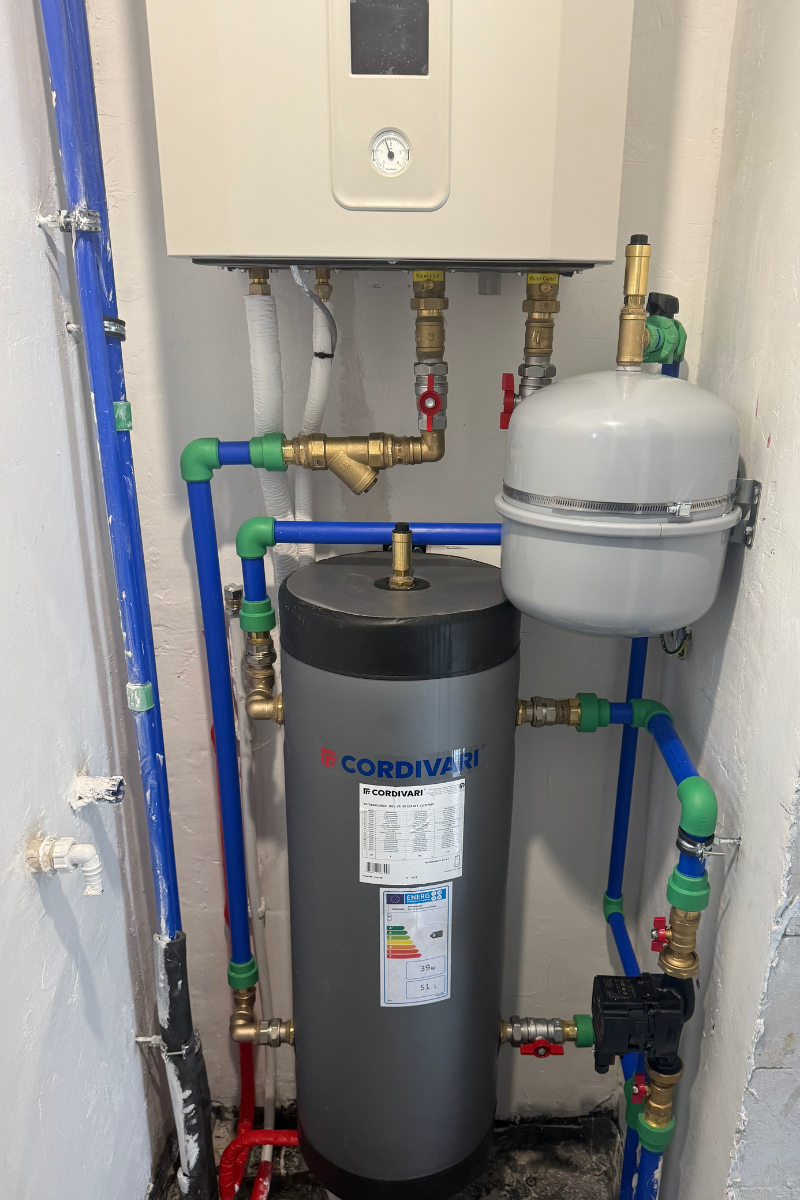 Gyakori kihívás felújításkor a szűkös hely. Itt látható, hogyan fér el egy komplett fűtési-hűtési központ mindössze 1 négyzetméteren. Átgondolt csővezetés, logikus elrendezés és könnyű hozzáférhetőség a karbantartáshoz – felesleges térveszteség nélkül.
